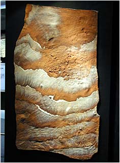 地下水が砂岩中に浸透していくとき、その中の溶存物質が、浸透する地下水の前線で飽和濃度に達すると、そこで沈殿しこのような周期的な輪をつくりだします。しかしなぜ浸透の前線がスムーズな曲線を描くのか、なぜもっと大きな輪にならなかったのか、たくさんの疑問が残っています。