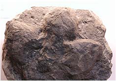 ハドロサウルス類の足跡です。この足跡の大きさから判断して、この恐竜の全長は10メートル近くにも達すると思われます。これは足跡の凹みを埋めた砂からできた雄型です。