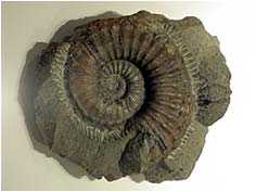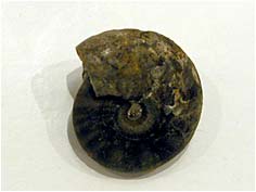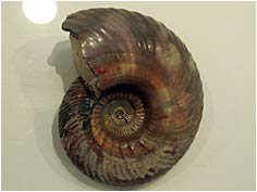 現在のオウムガイや貝類の殻には様々な色模様がありますが、アンモナイトの殻にも色模様がみつかることがあります。多くは放射状や同心円状の模様ですが、これらがもともと何色だったのかは残念ながらわかりません。北海道産のアンモナイトの中にも色模様と思われる模様が稀に見つかります。