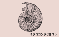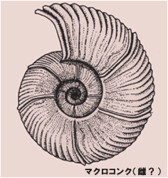 アンモナイトの殻には、マクロコンクとミクロコンクといわれる二型が知られています。両者の殻の形は成長を通じてよく似ていますが、ミクロコンクはマクロコンクに比べて成殻のサイズが小さく、殻口部に突起を持つものもあります。産出する場所や時代が同じであることから、これらは同じ種類の雌雄と考えられています。一般に大きい方(マクロコンク)が雌、小さい方(ミクロコンク)が雄と考えられていますが、明確な根拠はないようです。