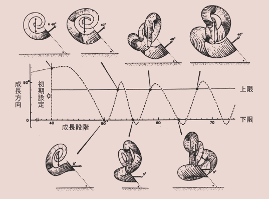 ニッポニテスの形づくりについて魅力的な仮説が提唱されています。ニッポニテスは、平面巻き、右巻き、左巻きといった3通りの成長プログラムを持ち、姿勢が高くなり過ぎたときには、右または左巻きを用いて姿勢を低くし、逆に低くなり過ぎたときには平面巻きに戻して姿勢を起こすと考えます。この仮定のもとで、形をコンピュータでシュミレートすると、ニッポニテスの形を見事に再現することができます。