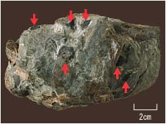 多数のアンモナイトの顎器(矢印)が含まれている。