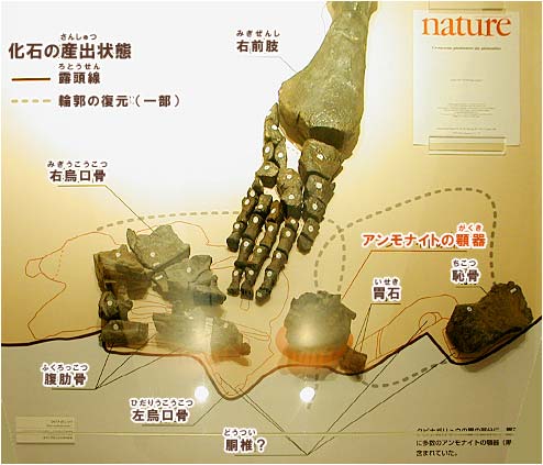 北海道の白亜紀層からは、クビナガリュウ化石のちょうど胃にあたる部分から、胃石、サメの歯、貝殻片とともに多数のアンモナイトの顎器が見つかっています。クビナガリュウは確実にアンモナイトを食べていたようです。