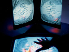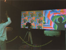 作品の中に差し入れた手がビデオカメラで画面に取り込まれ、その数が増えたり色が変わったりする。これはビデオ技術を使った万華鏡のようなしくみで、思いもかけない不思議な映像が現れることもある。