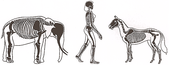 さて、私たち自身はどうだろうか。胴体はやや細長いが、直立しているので楽に支えられる。脚もまっすぐである。つまり、ヒトの身体のデザインはゾウと似ている。ちなみに、ゾウを後ろから見ると、太いズボンをはいた人間とそっくりである。なお、ヒトもゾウも足にアーチがあるという共通点がある。 では、なぜ、ゾウほど大きくないヒトがゾウと同じ構造なのだろうか。それは、ヒトが腕という移動にはほとんど役に立たないデッドウェイトを背負って、二本足だけで立って歩いているからである。そのために、ヒトは相対的には大型動物と同じなのだ。ヒトが何とか自慢できるのは、長距離を歩くことである。ヒトも走ることができるが、あくまで二次的な能力であって、ネコやウマから見れば小走り程度にすぎない。 |