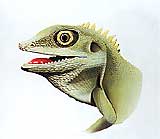 両生類の時代までに獲得されていた肺呼吸に加えて、爬虫類は殻のある卵を進化させ、完全な陸上生活に進出した。最古の標本は約3億年前の石炭紀後期の岩石の中から発見されている。爬虫類の種類は非常に多いが、ここではトカゲの顔を例として示そう。頭部に関して重要なことは、一般に、鼻腔と口腔が区別されたこと、そして頸部すなわち「くび」が出現したことである。