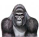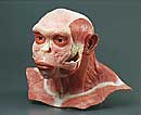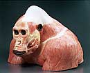 ゴリラの顔と頭は大きい。それは食物を噛むための咀嚼筋が発達しているからである。巨大な頭の大部分は側頭筋という筋肉によって占められている。側頭筋はコメカミ(米を噛む時に動くので)の筋肉であり、頭から始まって下顎骨の筋突起(顎関節の前方の突起)に付き、下顎骨を上後方へ引っぱる。 側頭筋は、ピテカントロプスでは文字通り側頭部にあるだけだが、ゴリラでは頭全体をおおい、それでも足りなくて、さらに頭の真ん中と後ろにT字型に組み合った骨の隆起(矢状稜と後頭稜)を作り、そこに付いている。ゴリラの側頭筋の体積は片側だけで1リットルはあり、ピテカントロプスの5倍以上も大きい。 ゴリラの顔を大きく見せているのは、頬の部分の咬筋である。咬筋は、頬骨とその後方の頬骨弓の下から始まって下顎骨の下顎角(いわゆるエラの部分)に付き、下顎骨を上前方に引っぱる。この咬筋もゴリラではピテカントロプスよりはるかに大きい。つまり、ゴリラの咀嚼筋は全体としてピテカントロプスの数倍あり、現代人の10倍以上もある。もちろん、ゴリラの雄は体重が200キログラムもあるので、咀嚼筋の大きさも割り引かなければならないが、それにしても強力である。 |