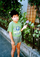 | オーストラリアに派遣されて半年、植物の研究は順調に進んでおります。当地にて発見しました新種アサガオのレプリカを作成しましたのでお届けいたします。植物コーナーに展示くださるよう御手配ください。ところで先日、ハリケーンを体験しました。凄まじいのなんのといいながら、科学者らしくさすがは北半球の台風とは渦は逆向きだと冷静に確認すると同時に感心しておりました。同封しましたのはアサガオと息子の博司のツーショット写真です。 |
